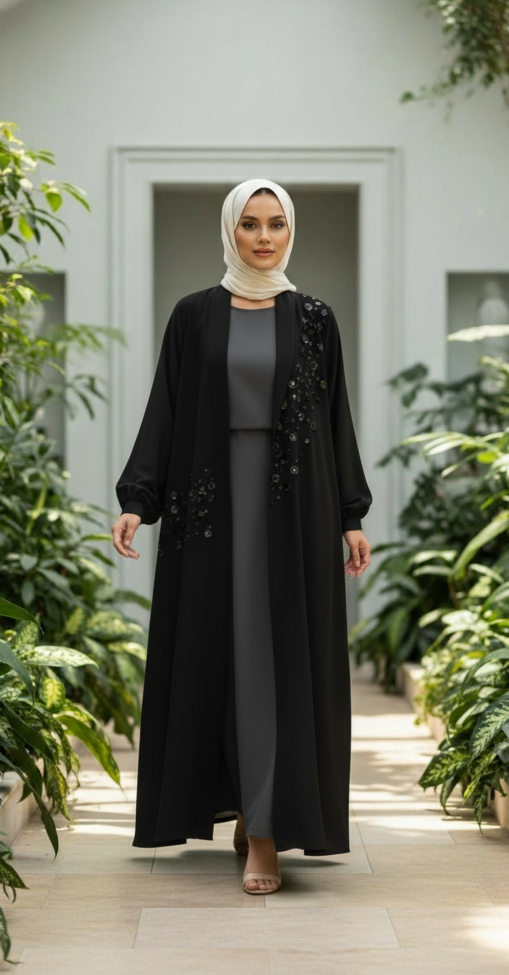تألّقي بعباية تجمع بين الفخامة والبساطة، مصممة بخامة عالية الجودة تعطيك راحة في اللبس وأناقة في الظهور.